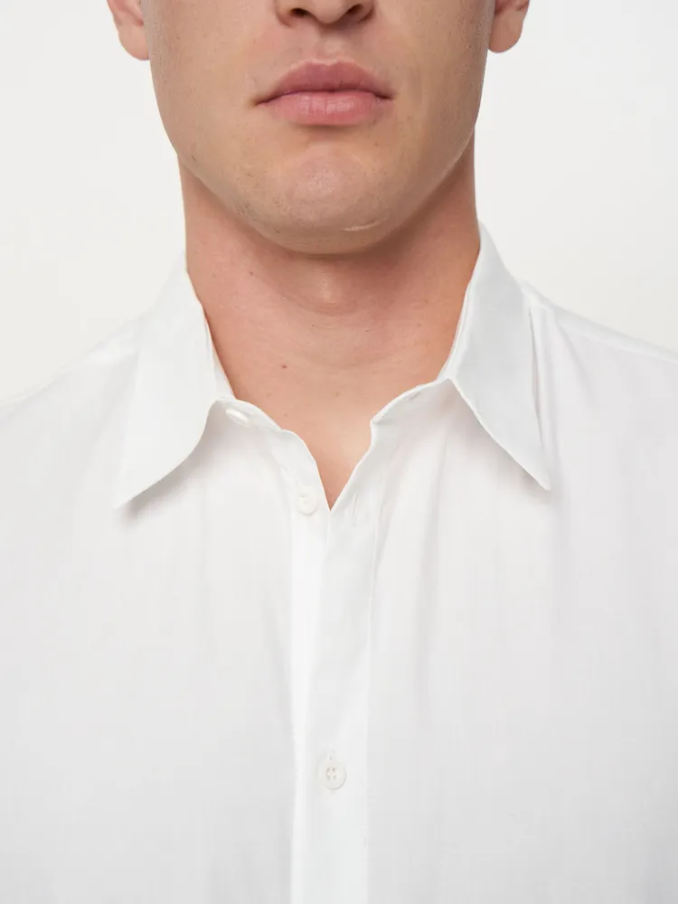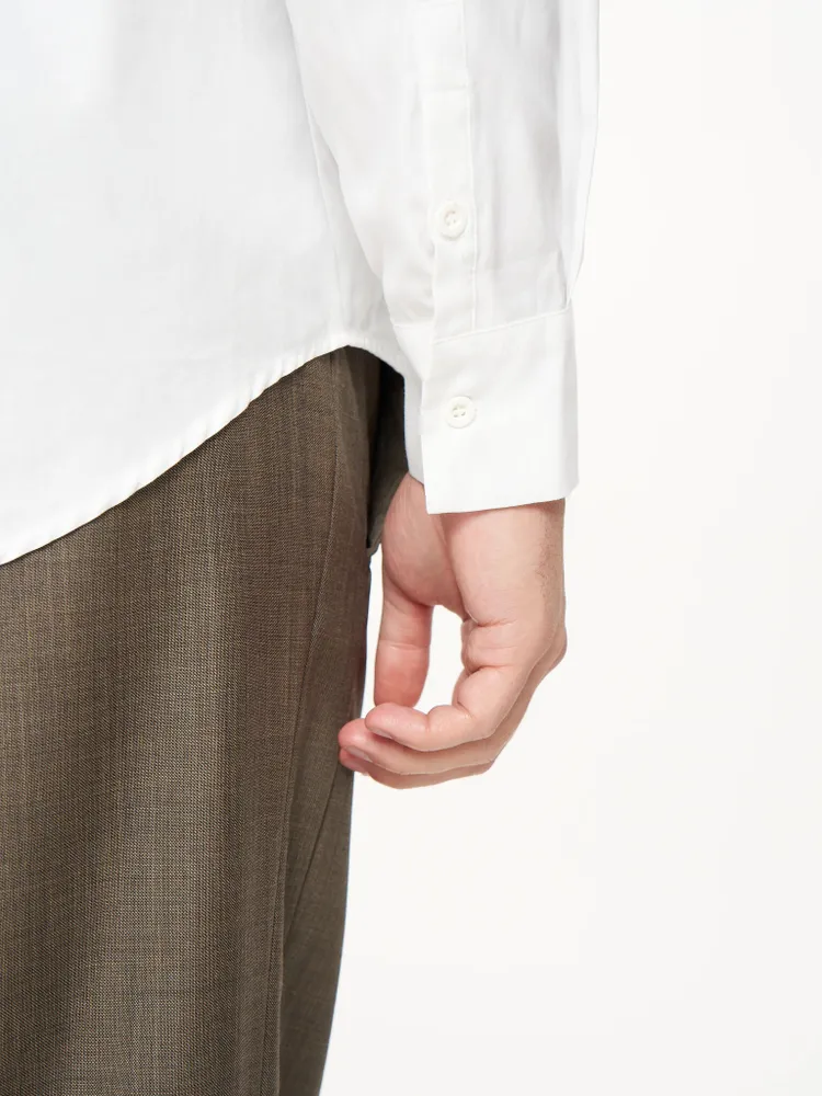 Рубашка из плотного хлопка в чистом белом цвете. Классический силуэт и продуманный крой подчеркивают универсальность модели: она одинаково уверенно смотрится в деловом образе и в повседневных сочетаниях.